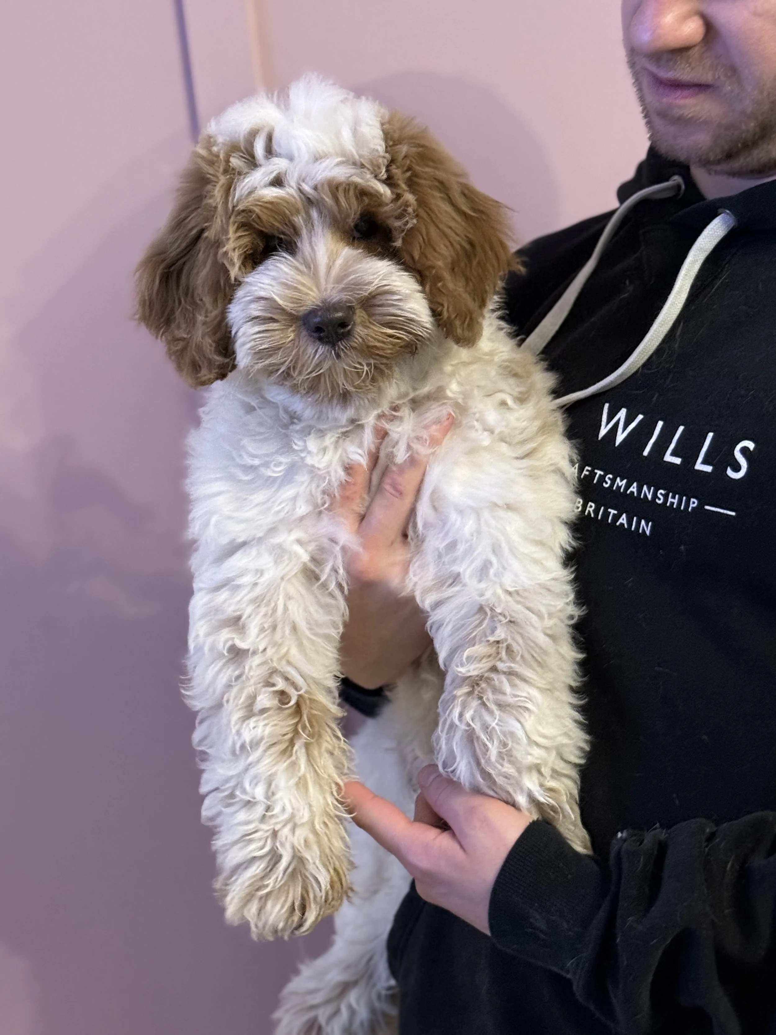 We expect some of the red / caramel puppies may look similar to Barnaby’s and his white markings, but this will develop with age. Roan puppies are born almost white and their red patches appear gradually, so we will add examples to show how their colours usually mature.